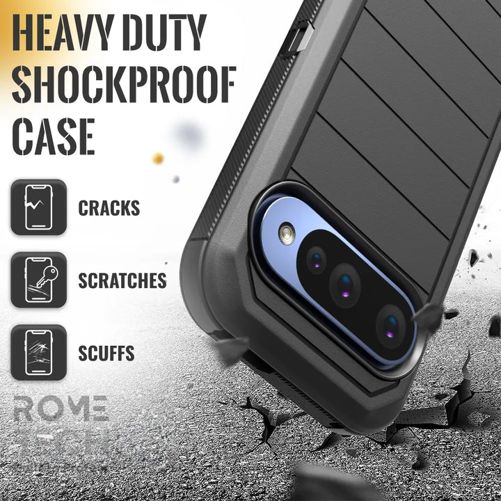 Protective Cases for Google Pixel 10 / Pixel 10 Pro a is four layers of 360-degree heavy-duty shockproof protection. Our defender case is made out of durable materials with a hard polycarbonate inner shell and soft outer rubber layer. Raised beveled edge keeps your touchscreen safe from scratches. A 360-degree swivel belt clip also functions as a kickstand with different viewing angles perfect for video calls and media playback. Defender case also have easy access to the charging port, buttons, sensors, and camera. Built-in port covers offer protection from dust, dirt, and other elements, making it ideal for commercial use. Rome Tech's Defender case multi-layer design offers rugged drop protection ideal for outdoor adventures, sports, hiking and guards your device against scrapes, bumps, dirt, and dust.