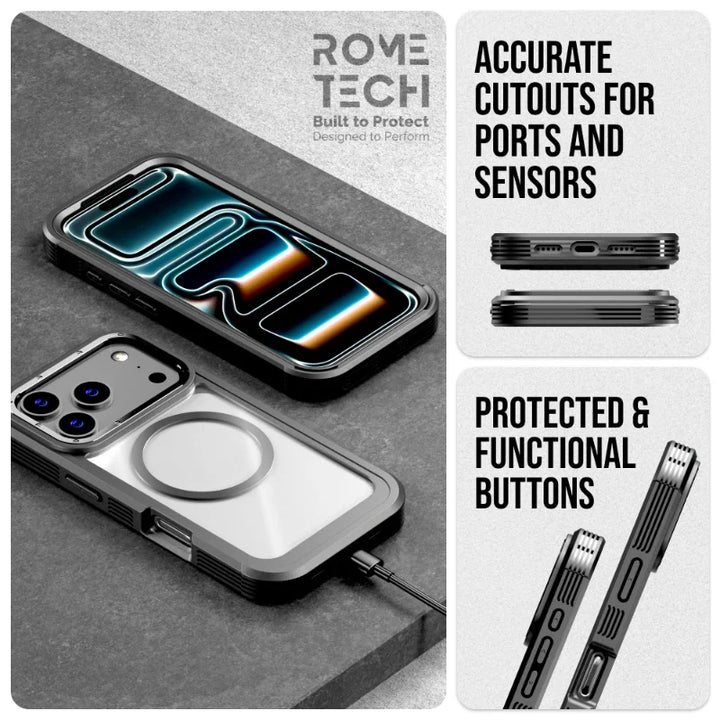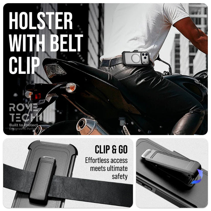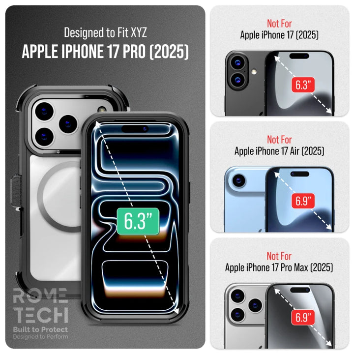 Protective Cases for Apple iPhone 17 Pro a is four layers of 360-degree heavy-duty shockproof protection. Our defender case is made out of durable materials with a hard polycarbonate inner shell and soft outer rubber layer. Raised beveled edge keeps your touchscreen safe from scratches. A 360-degree swivel belt clip also functions as a kickstand with different viewing angles perfect for video calls and media playback. Defender case also have easy access to the charging port, buttons, sensors, and camera. Built-in port covers offer protection from dust, dirt, and other elements, making it ideal for commercial use. Rome Tech's Defender case multi-layer design offers rugged drop protection ideal for outdoor adventures, sports, hiking and guards your device against scrapes, bumps, dirt, and dust.