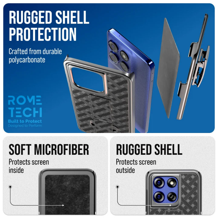 Motorola Moto G Stylus 5G de Rome Tech Esta funda con clip para cinturón ofrece una protección fiable para el teléfono gracias a su fabricación superior y materiales de alta calidad. Meticulosamente fabricada, esta funda ofrece una excelente protección contra arañazos, impactos y otros posibles daños. Gracias a la combinación de materiales de calidad y una estética elegante, Rome Tech garantiza que tu dispositivo no solo esté protegido, sino que también luzca impecable.