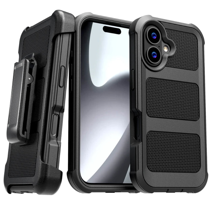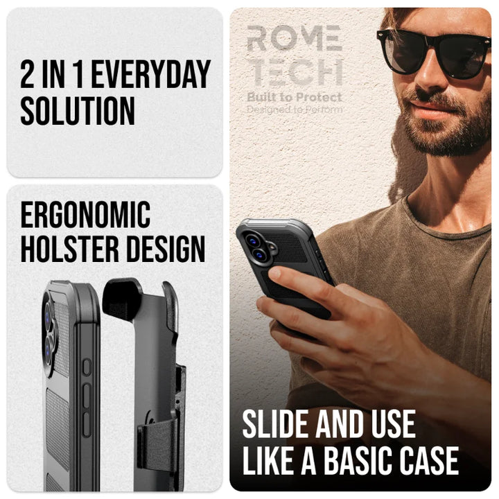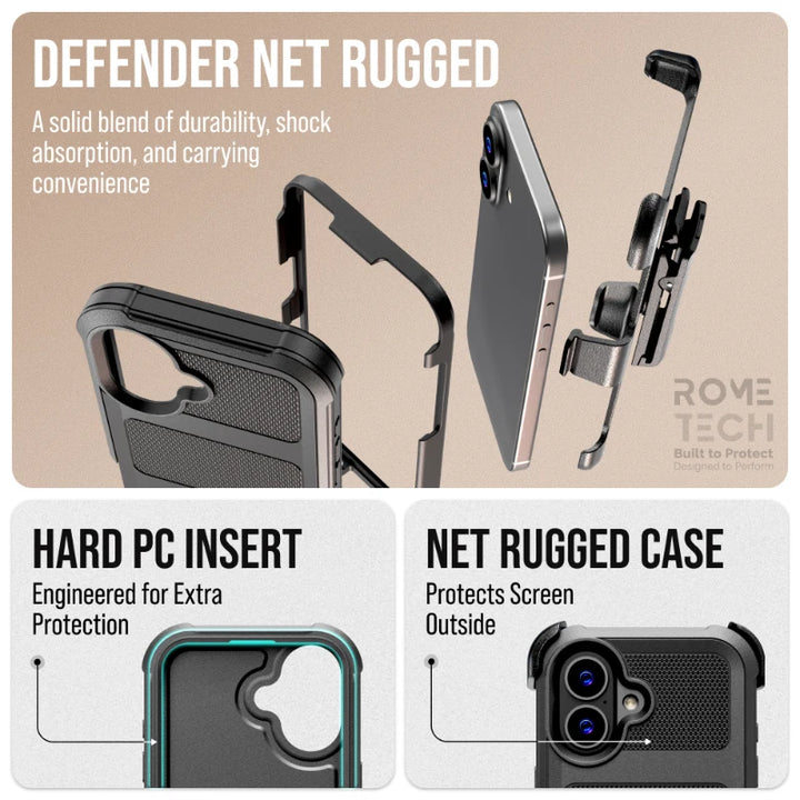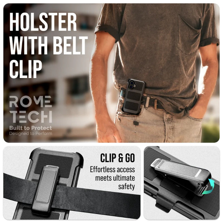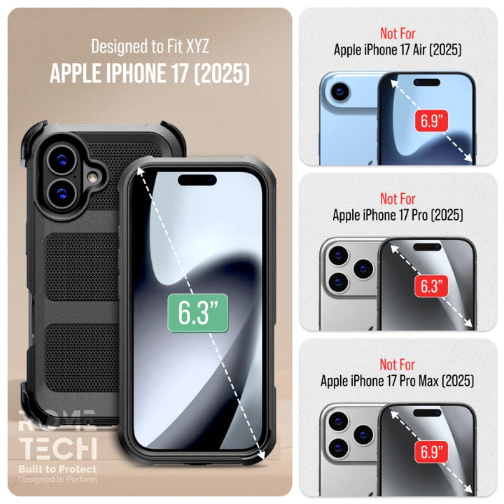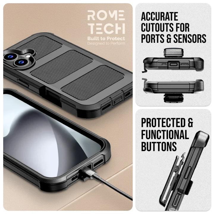 Protective Cases for Apple iPhone 17 a is four layers of 360-degree heavy-duty shockproof protection. Our defender case is made out of durable materials with a hard polycarbonate inner shell and soft outer rubber layer. Raised beveled edge keeps your touchscreen safe from scratches. A 360-degree swivel belt clip also functions as a kickstand with different viewing angles perfect for video calls and media playback. Defender case also have easy access to the charging port, buttons, sensors, and camera. Built-in port covers offer protection from dust, dirt, and other elements, making it ideal for commercial use. Rome Tech's Defender case multi-layer design offers rugged drop protection ideal for outdoor adventures, sports, hiking and guards your device against scrapes, bumps, dirt, and dust.