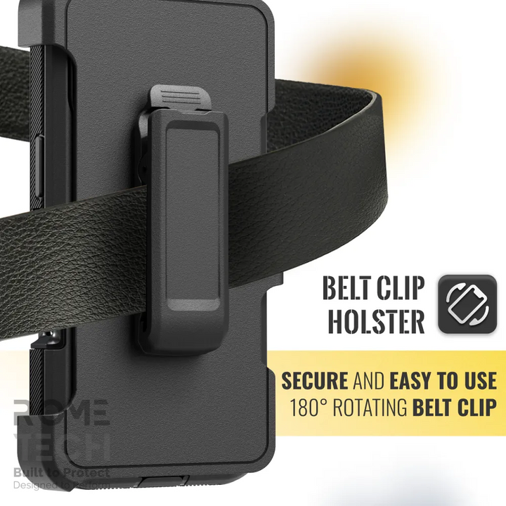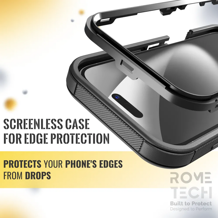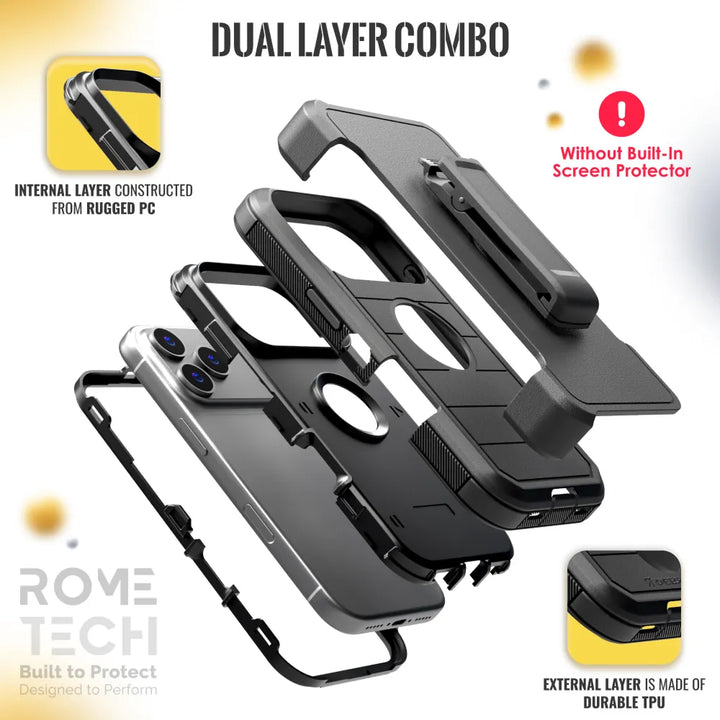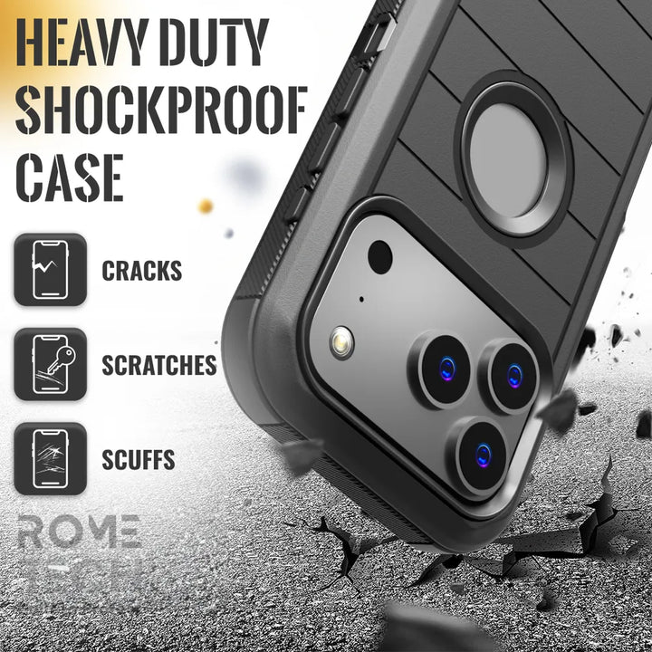 Protective Cases for Apple iPhone 17 Pro a is four layers of 360-degree heavy-duty shockproof protection. Our defender case is made out of durable materials with a hard polycarbonate inner shell and soft outer rubber layer. Raised beveled edge keeps your touchscreen safe from scratches. A 360-degree swivel belt clip also functions as a kickstand with different viewing angles perfect for video calls and media playback. Defender case also have easy access to the charging port, buttons, sensors, and camera. Built-in port covers offer protection from dust, dirt, and other elements, making it ideal for commercial use. Rome Tech's Defender case multi-layer design offers rugged drop protection ideal for outdoor adventures, sports, hiking and guards your device against scrapes, bumps, dirt, and dust.