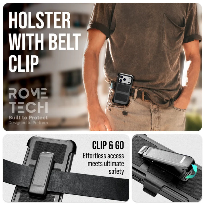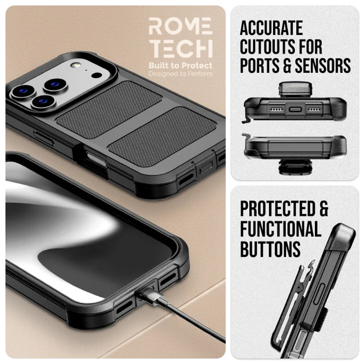Protective Cases for Apple iPhone 17 Pro a is four layers of 360-degree heavy-duty shockproof protection. Our defender case is made out of durable materials with a hard polycarbonate inner shell and soft outer rubber layer. Raised beveled edge keeps your touchscreen safe from scratches. A 360-degree swivel belt clip also functions as a kickstand with different viewing angles perfect for video calls and media playback. Defender case also have easy access to the charging port, buttons, sensors, and camera. Built-in port covers offer protection from dust, dirt, and other elements, making it ideal for commercial use. Rome Tech's Defender case multi-layer design offers rugged drop protection ideal for outdoor adventures, sports, hiking and guards your device against scrapes, bumps, dirt, and dust.